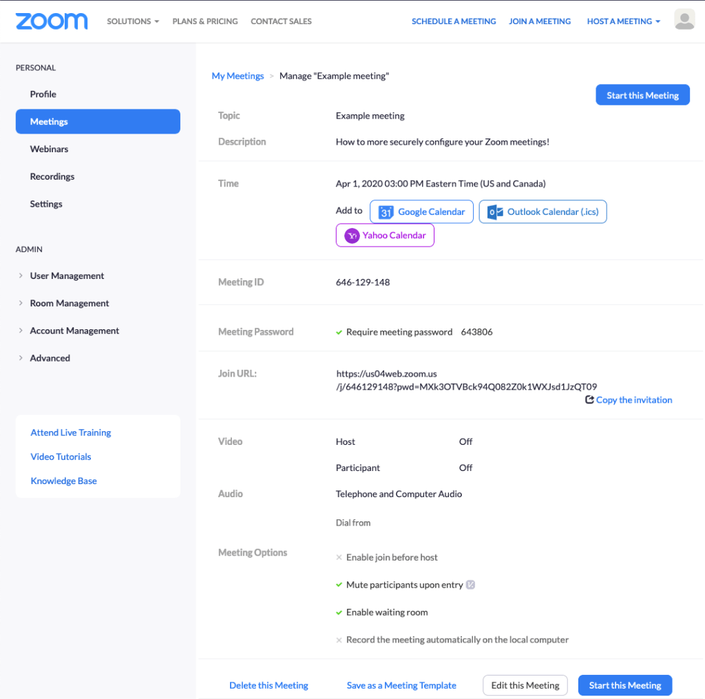 Notice the “Save as a Meeting Template” link at the bottom? Use that so that when you create meetings in the future, you won’t have to manually configure these settings again! Name it something that makes sense to you, and save it!