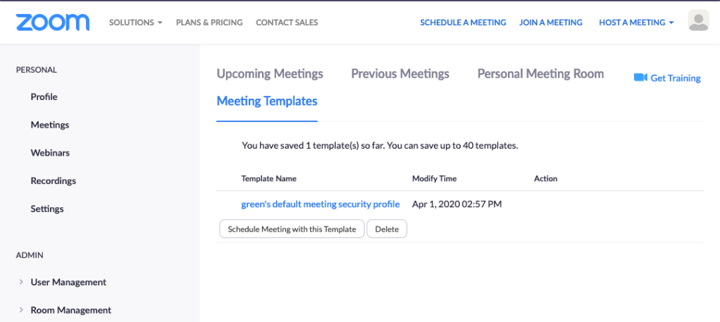 Now, when you want to create a meeting in the future, all you have to do is click on the “Meeting Templates” link at the top of the page, and you will see the template along with a button that you can click to create a new meeting using these settings.