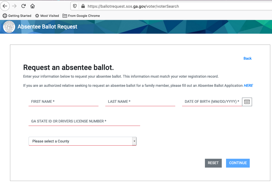 Any Georgia citizen can request an absentee ballot be mailed to them by using a secure website set up by the Secretary of State. Georgia citizens can make this request for any reason and do not have to justify the request. The URL to begin the request is https://ballotrequest.sos.ga.gov/. Once there, click the “REQUEST ABSENTEE BALLOT” button to start the request. Next, you will be taken to a search page used to locate your record. The page asks you for the necessary information to find your record, as shown in the image below: