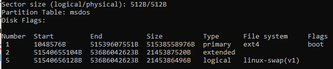 parted -s container/image.raw unit b printto get the data I needed in order to mount the partition. Below is my output – yours may vary. The important thing to pick up is the value in the “Start” column for the boot sector. In my case, it was 1045876